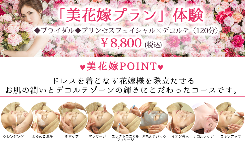 ですから、美花嫁体験コースはどろんこフェイシャルコースにうるおいのイオン導入とデコルテケアを組み込んでいます。